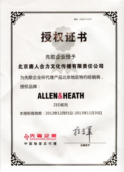 ALLEN&HEATH(艾伦赫赛)调音台授权书(北京地区代理)
