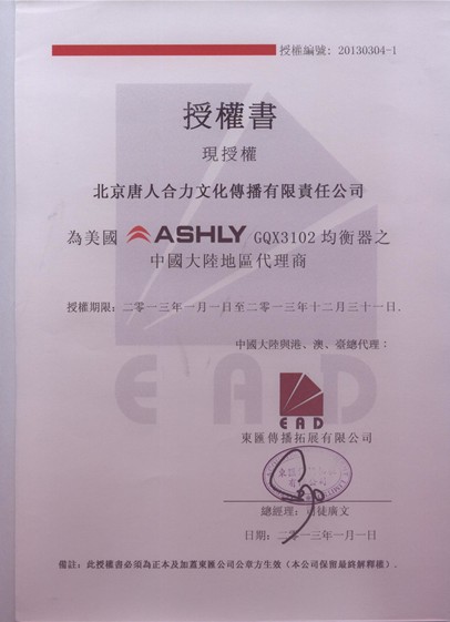 ASHLY(雅士尼)周边GQX3102均衡器授权书(国内总代理)