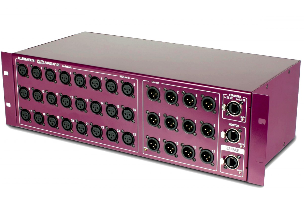 当AR2412连接到GLD-80 或GLD-112调音台时,可提供24路XLR卡侬输入和12路XLR卡侬输出。您可使用一根采用Allen & Heath的dSNAKE协议的Cat5电缆连接,这可让AR2412离调音台最多120米远。通过dSNAKE可控制远程前置放大器,所有话放都可进行场景调用。对于较大的系统来说,可以将一台GLD-AR84或AB168扩展音频机架连接到AR2412,以增加最多16路XLR卡农输入和8路XLR卡侬输出。AR2412还拥有一个可兼容Aviom® Pro16的监听端口。